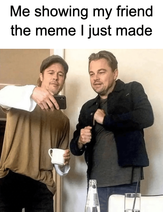 This template combines Leo and Brad to make a great meme. It is used most often to highlight you showing something on your phone to someone else like news, sports, memes etc. It's very versatile in the way it can be used
